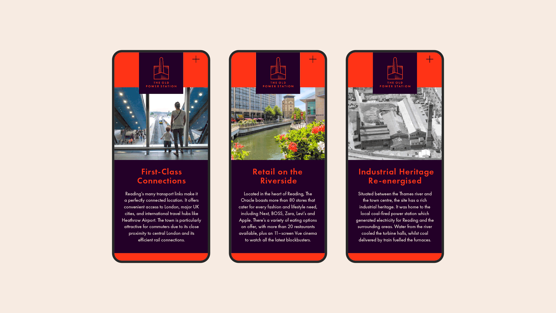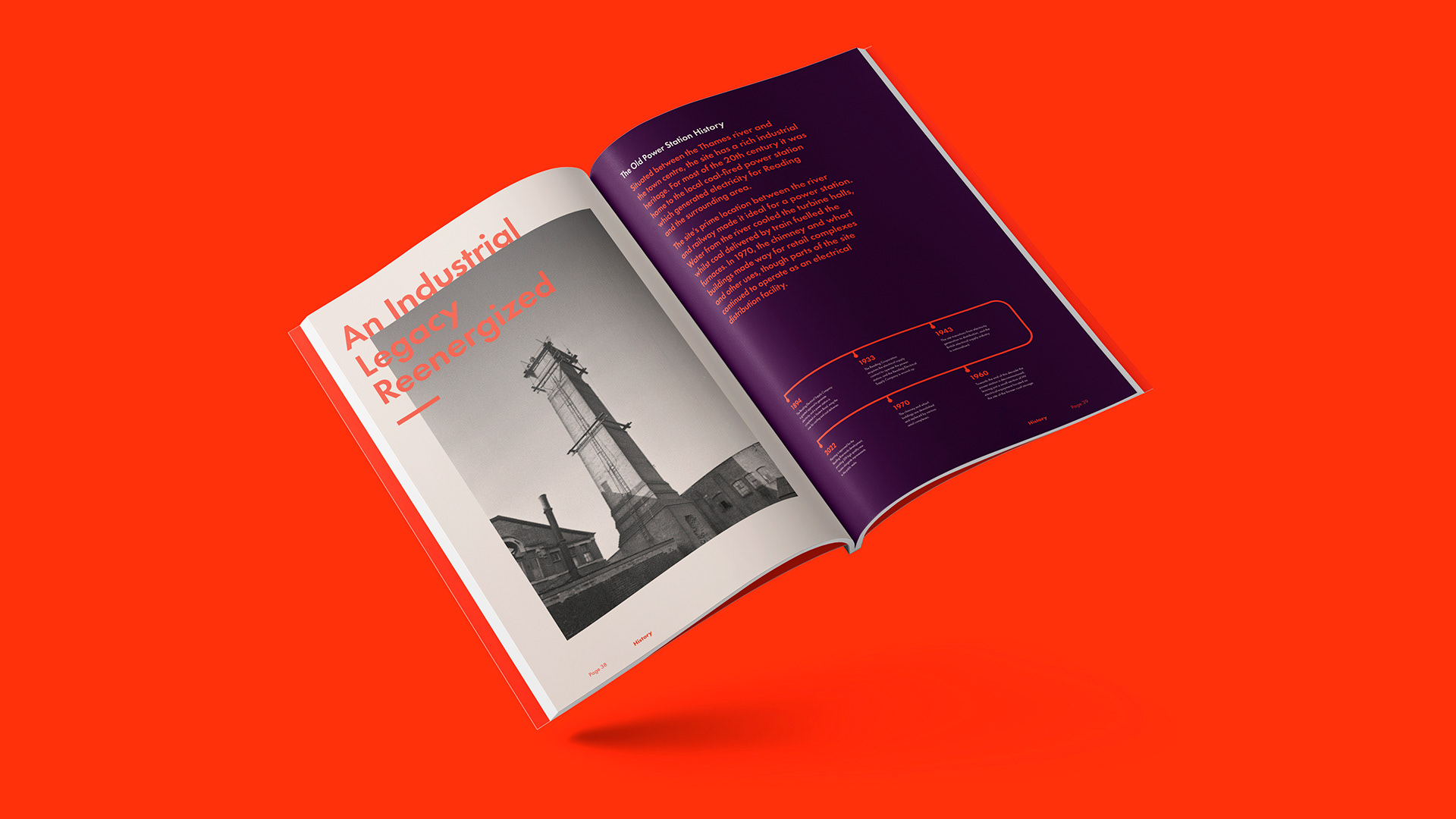 The brand identity celebrates the old power station's Art Deco heritage. This is reflected in the 1920s-inspired symbol and colour palette directly sourced from the original red brick wharf building and chimney. The brand's tone of voice is direct, playful, and informative, while the visual language explores the idea of 'energy' through powerful messaging and iconography.